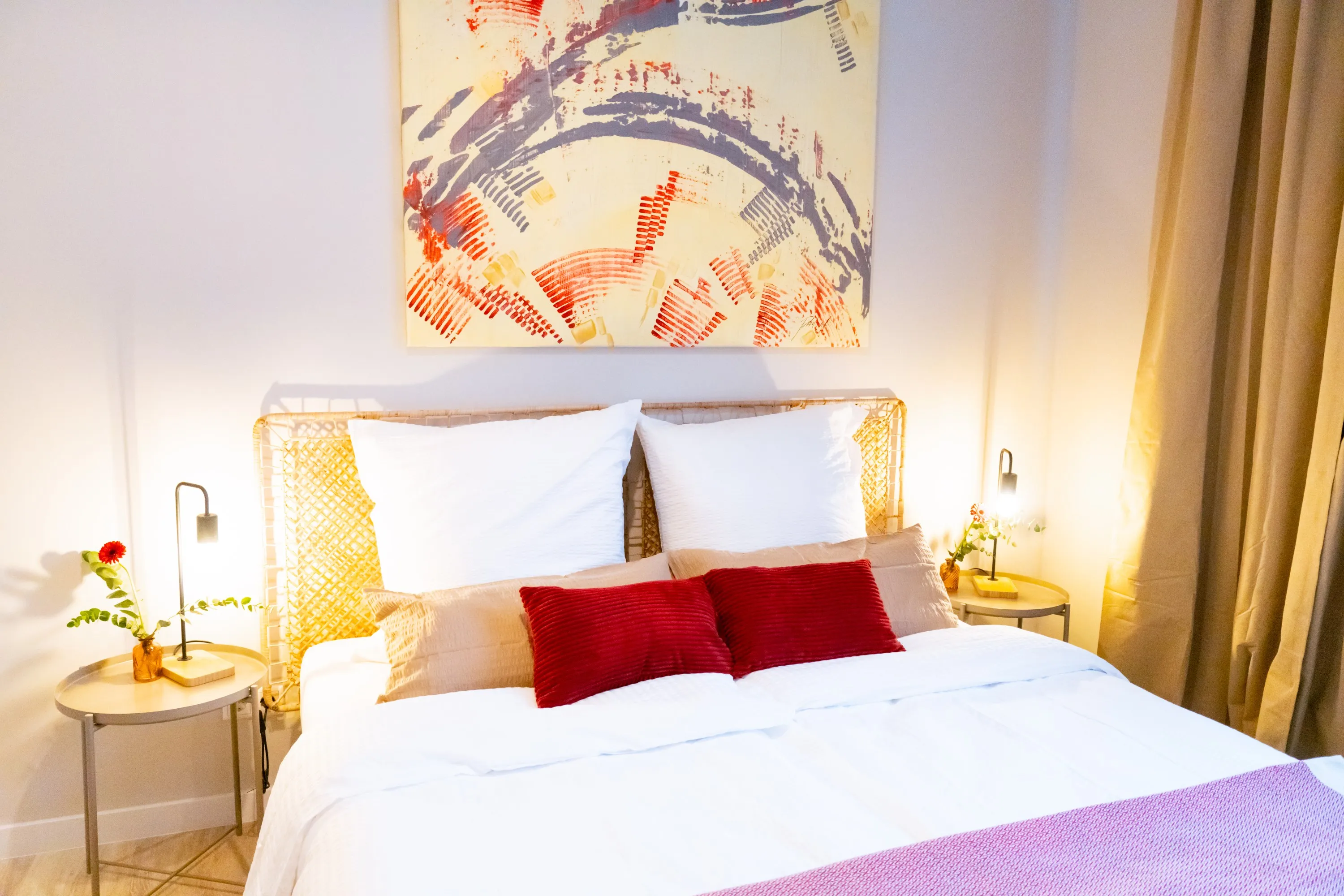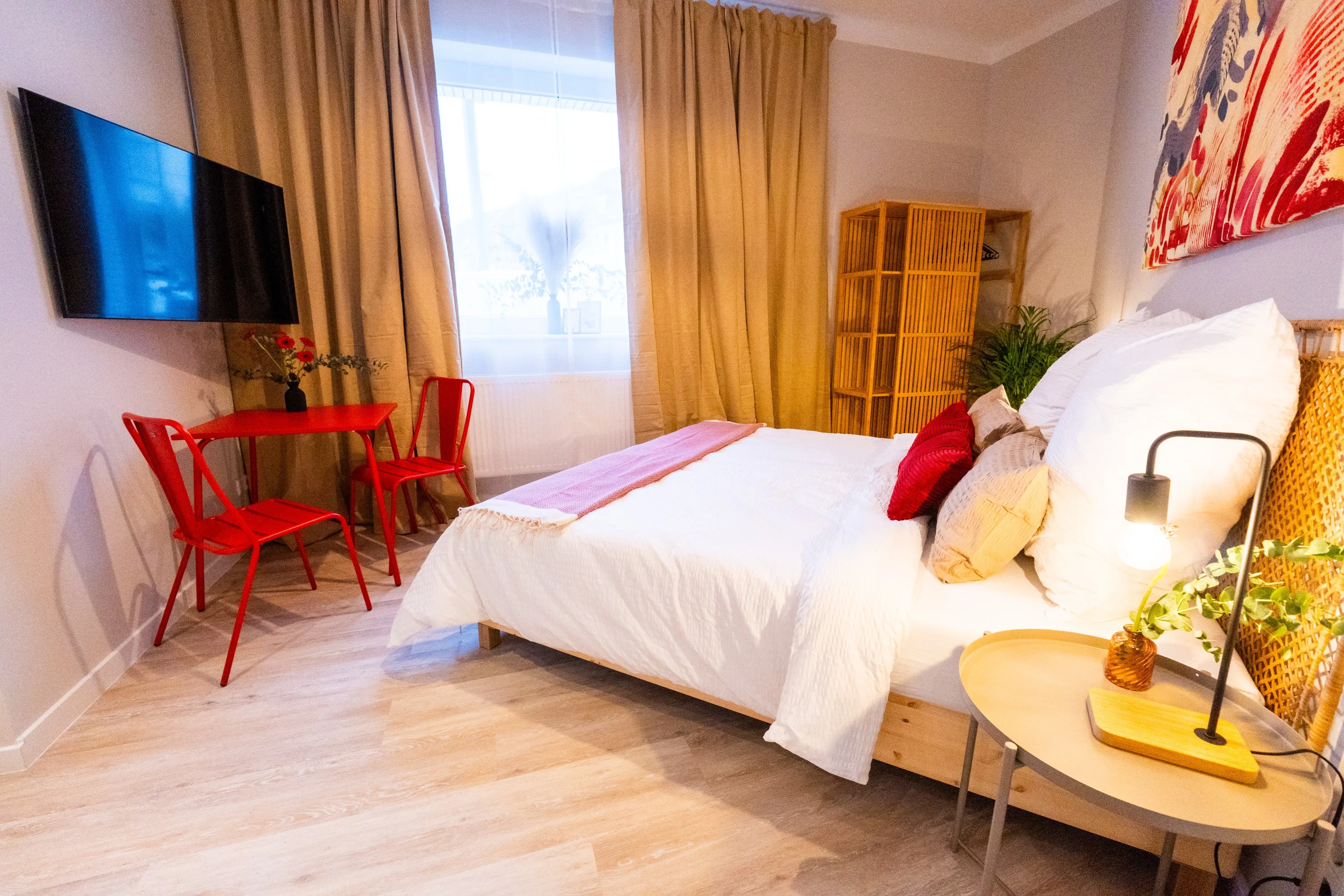 Wohnung war Stilvoll eingerichtet und die Betten sehr gut. Dazu alles geräumig gehalten. Fernseher hatte ein großes Bild. Und jedes Schlafzimmer hatte einen eigenen kleinen Schreibtisch. Dazu ein 2 Platten Induktionsfeld für die Küche. Die Bahn fast vor der Tür bringt einen Einfach ins Zentrum von Berlin.